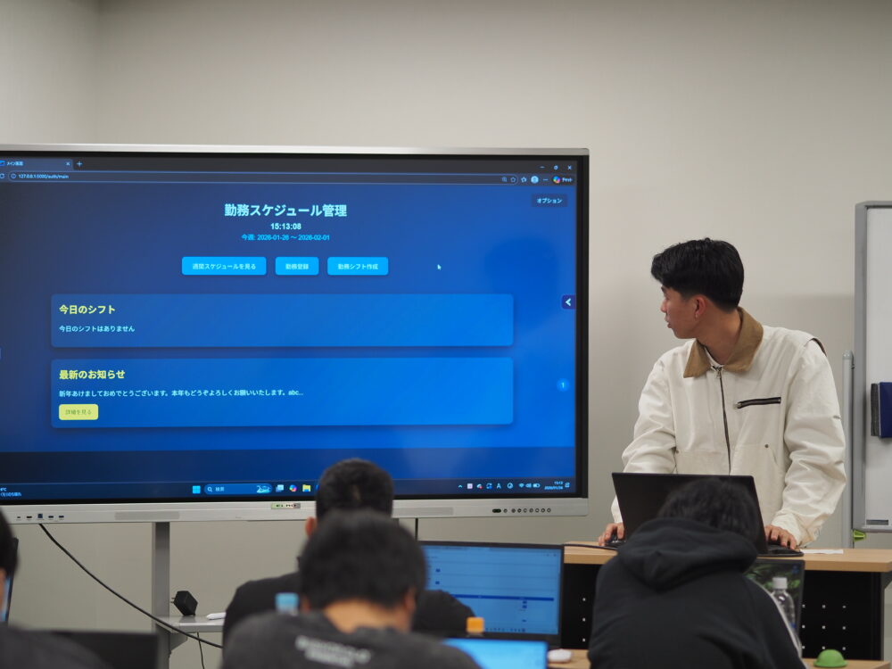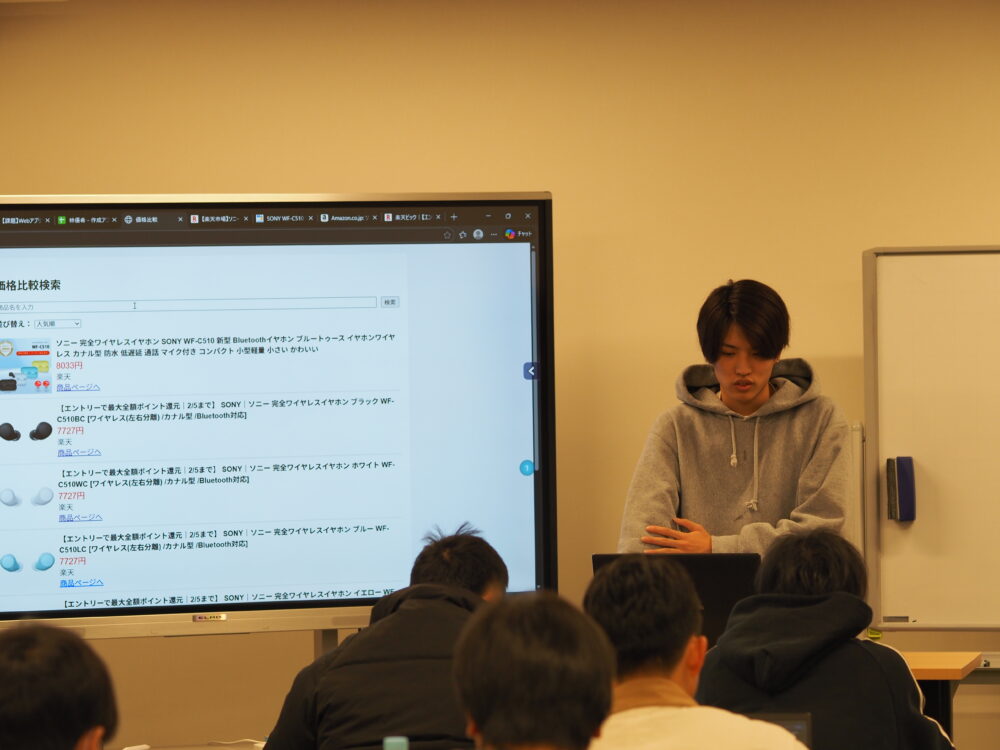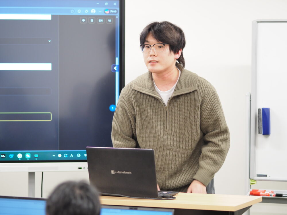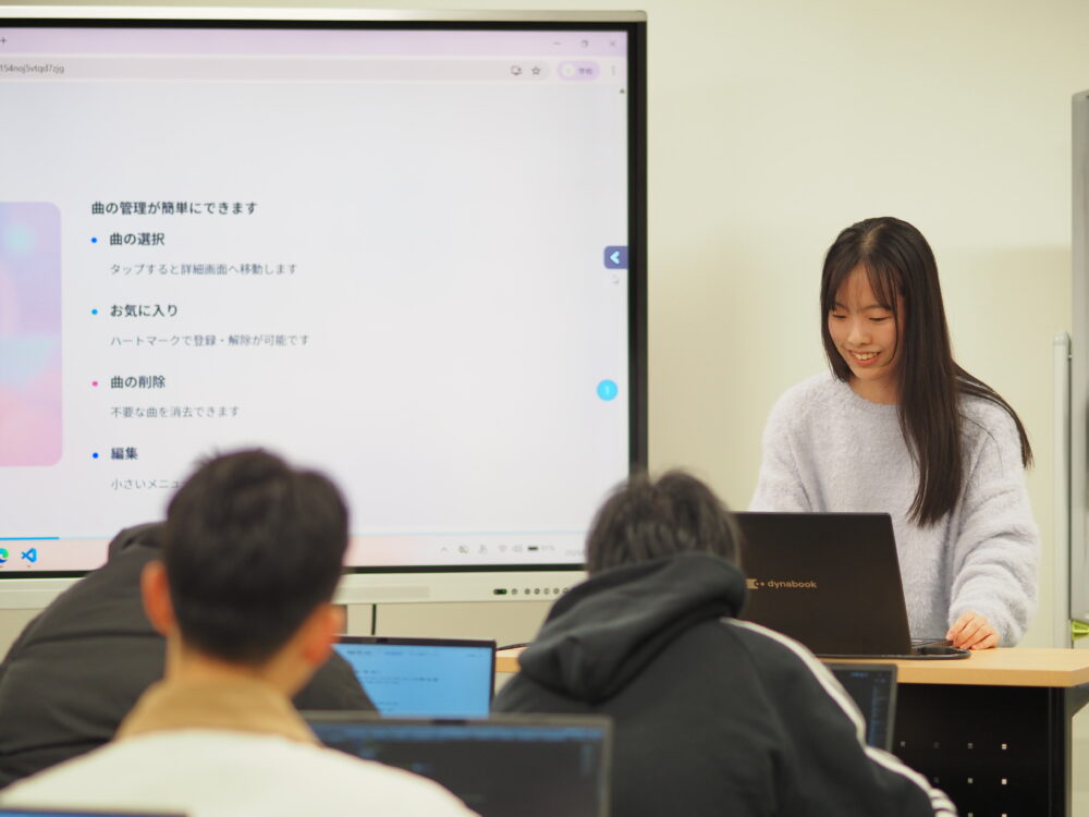 先日、1年生の最後の授業として、オリジナルアプリの制作発表会を行いました。