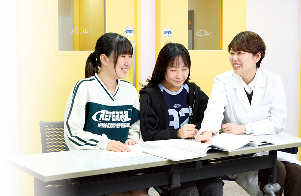 学科責任者がサポート!履歴書作成、一人ひとりに適した志望動機を一緒に考えてくれる「担任」、面談マナーを指導する「就職対策授業担当」、卒業生や医療機関とのコンタクトを担う「学科責任者」がタッグを組み、一人の学生を徹底サポート。志望先へは学生を最もよく知る担任が、その学生の強みや魅力を最大限に伝えます。