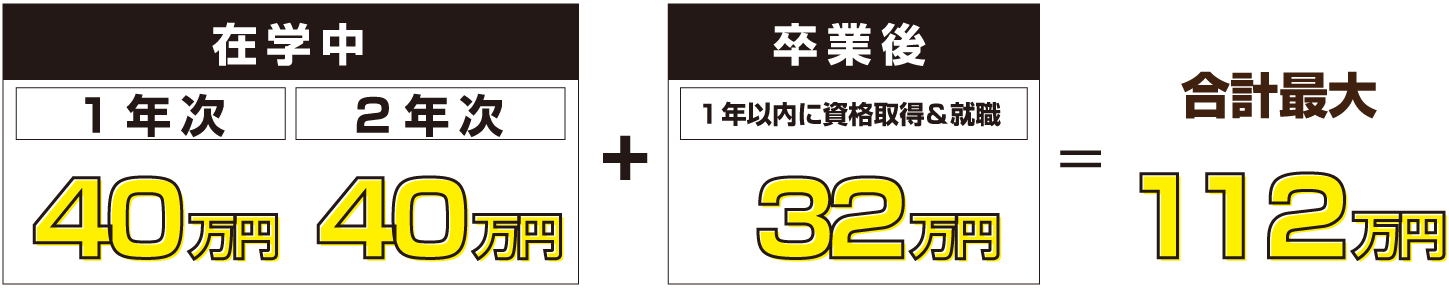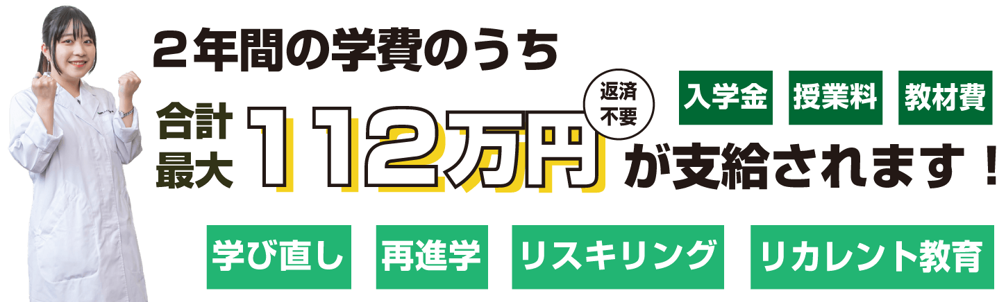obmのバイオ技術学科、医療事務総合学科の場合は、合計最大112万円の給付が受けられます。